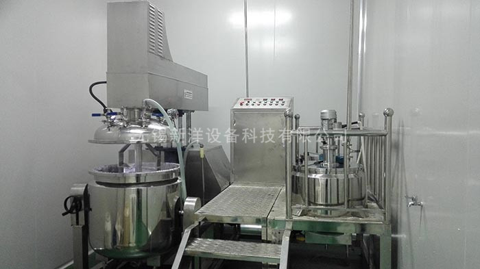 物料在水鍋、油鍋內(nèi)通過加熱、攪拌進(jìn)行混合反應(yīng)后,由真空泵吸入乳化鍋,通過乳化鍋內(nèi)上部的中心攪拌、聚四氟乙烯刮板始終迎合攪拌鍋形體,掃凈掛壁粘料,使被刮取的物料不斷產(chǎn)生新界面,再經(jīng)過葉片的剪斷、壓縮、折疊,使其攪拌、混合而向下流往鍋體下方的均質(zhì)器處,物料再通過高速旋轉(zhuǎn)的切割輪與固定的切割套之間所產(chǎn)生的強(qiáng)力的剪斷、沖擊、亂流等過程,物料在剪切縫中被切割,迅速破碎成200um-0.2um的微粒,由于乳化鍋內(nèi)處于真空狀態(tài),物料在攪拌過程中產(chǎn)生的氣泡被及時(shí)抽走。采用抽真空的方式,使所生產(chǎn)的制品在攪拌過程中不再混入氣泡,從而保證可制造出富有光澤、細(xì)膩及延展性良好的產(chǎn)品。